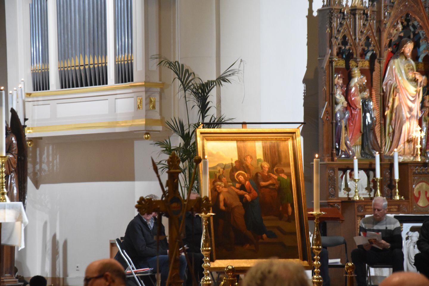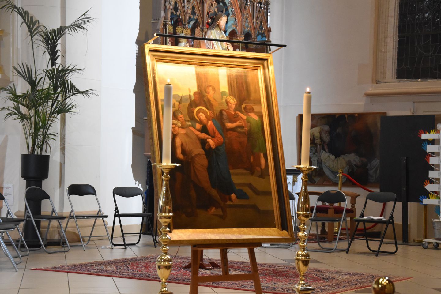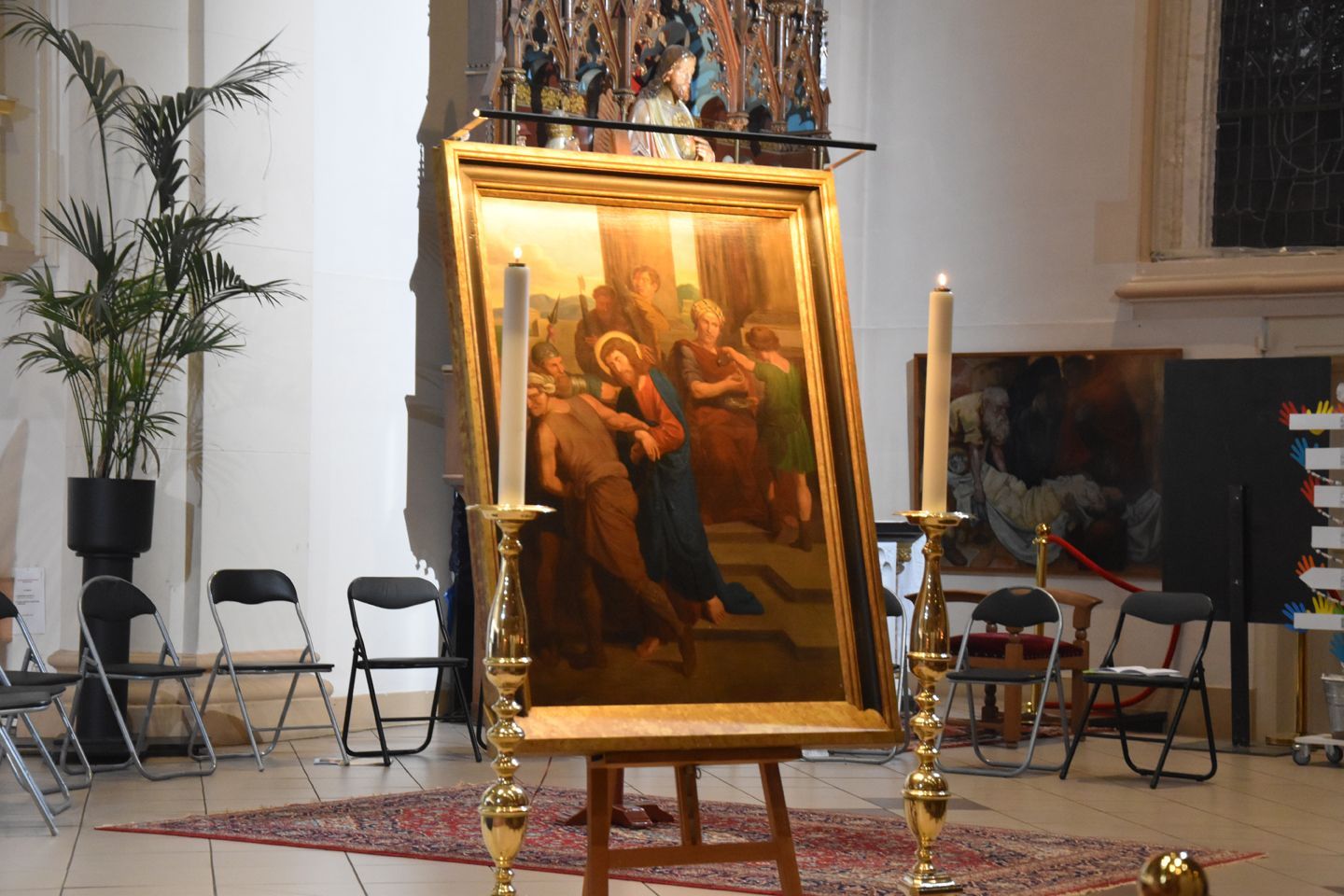 Het maakt dan niet uit of het verhaal verteld wordt in de kerk, op TV of, zoals hier in Volendam bij de Kruiswegwandeling, in winkels, bij de banketbakker, in de lingeriezaak 2 nog wel, een café of het voetbalstadion. Als je zo’n schilderij tegenkomt de komende dagen… sta er eens bij stil. Denk erover na. Meer is niet nodig.